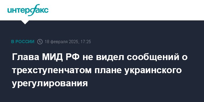 Москва. 18 февраля. INTERFAX.RU - Глава МИД РФ Сергей Лавров заявил, что не видел никаких сообщений о трехступенчатом плане украинского урегулирования.