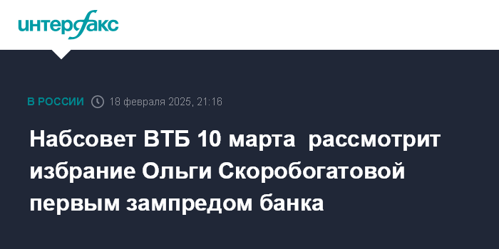 Москва. 18 февраля. INTERFAX.RU - Наблюдательный совет ВТБ на заседании 10 марта может рассмотреть вопрос об избрании Ольги Скоробогатовой первым заместителем президента-председателя правления банка, сообщили "Интерфаксу" в пресс-службе кредитной организации.
