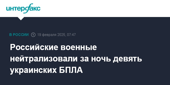 Москва. 19 февраля. INTERFAX.RU - Российские военные сбили и подавили в ночь на среду девять украинских беспилотников, сообщили в Минобороны РФ.