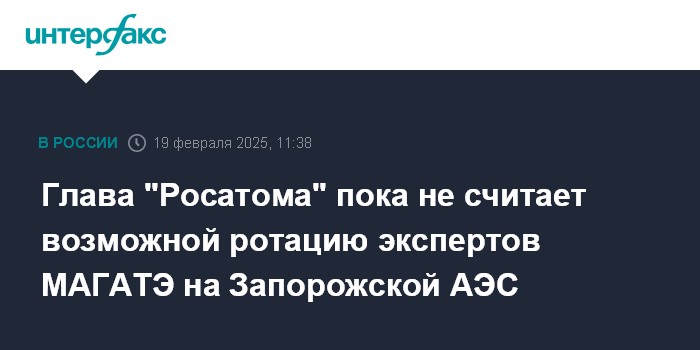 Москва. 19 февраля. INTERFAX.RU - Условия, которые сложились к нынешнему моменту на Запорожской АЭС, не позволяют провести ротацию экспертов Международного агентства по атомной энергии, заявил телеканалу "Россия 24" глава "Росатома" Алексей Лихачев.