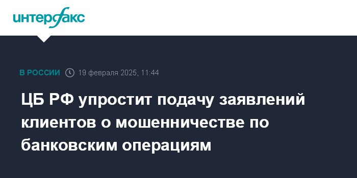 Москва. 19 февраля. INTERFAX.RU - ЦБ РФ планирует упростить подачу заявлений от клиентов, столкнувшихся со случаями мошенничества в банковской сфере, заявила глава Банка России Эльвира Набиуллина, выступая на форуме по кибербезопасности в финансах.