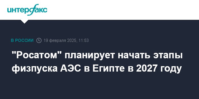Москва. 19 февраля. INTERFAX.RU - "Росатом" рассчитывает перейти к физпуску на АЭС "Эль-Дабаа" в Египте в 2027 году, сообщил телеканалу "Россия-24" глава госкорпорации Алексей Лихачев.