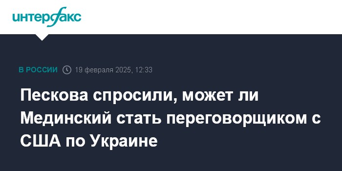Москва. 19 февраля. INTERFAX.RU - Вопрос назначения переговорщика с американцами по украинскому урегулированию зависит от решения президента Р Владимира Путина, заявил его пресс-секретарь Дмитрий Песков, когда его спросили, может ли переговорщиком с российской стороны быть назначен помощник президента Владимир Мединский.