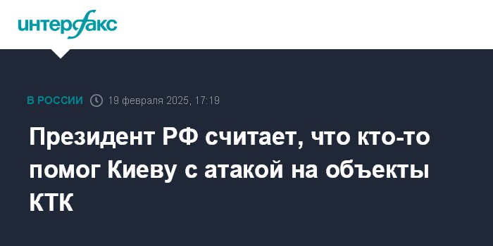 Москва. 19 февраля. INTERFAX.RU - Украинские военные не могли самостоятельно нанести удар по нефтеперекачивающей станции Каспийского трубопроводного консорциума (КТК) в Краснодарском крае, им кто-то из западных союзников предоставил необходимую для нападения информацию, заявил президент РФ Владимир Путин.