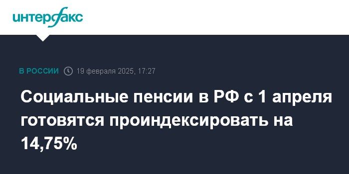 Москва. 19 февраля. INTERFAX.RU - Размер индексация социальных пенсий россиян с 1 апреля составит 14,75%, соответствующий проект постановления правительства опубликован на портале проектов нормативных правовых актов в среду.