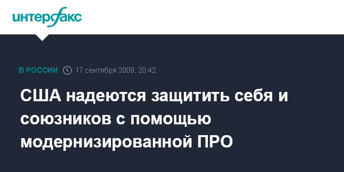 Москва. 17 сентября. INTERFAX.RU - Новая архитектура американской противоракетной обороны рассчитана на защиту США и их союзников в глобальном масштабе, заявил высокопоставленный американский военный.