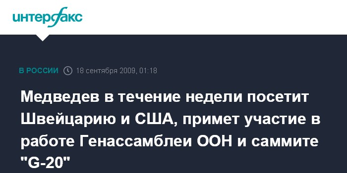 Москва. 18 сентября. ИНТЕРФАКС - Президент России Дмитрий Медведев в будущий понедельник отправится в недельное заграничное турне, в ходе которого посетит с государственным визитом Швейцарию, примет участие в работе Генассамблеи ООН и саммите Совбеза ООН в Нью-Йорке, а также саммите "Большой двадцатки" в Питтсбурге, и вновь встретится с президентом США Бараком Обамой.