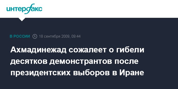 Москва. 18 сентября. INTERFAX.RU - Президент Ирана Махмуд Ахмадинежад заявил, что сожалеет о гибели демонстрантов в ходе акций протеста, последовавших после иранских президентских выборов 12 июня. "Все мы сожалеем, что погибли люди", - сказал он в интервью американскому телеканалу NBC.