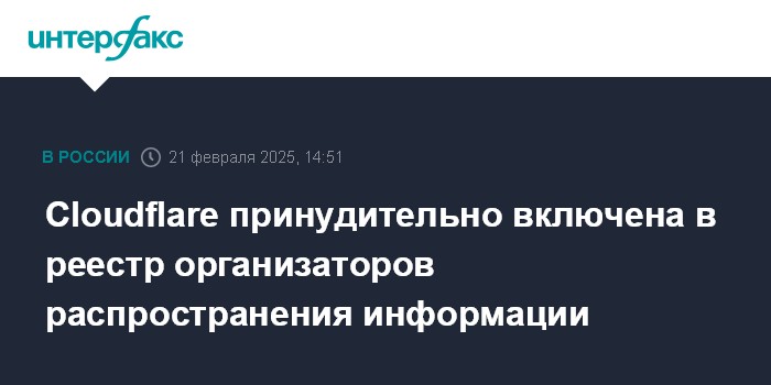 Москва. 21 февраля. INTERFAX.RU - Роскомнадзор принудительно включил компанию Cloudflare в реестр организаторов распространения информации (ОРИ) после двух вступивших в силу штрафов за отказ уведомить РКН о начале работы в качестве ОРИ.