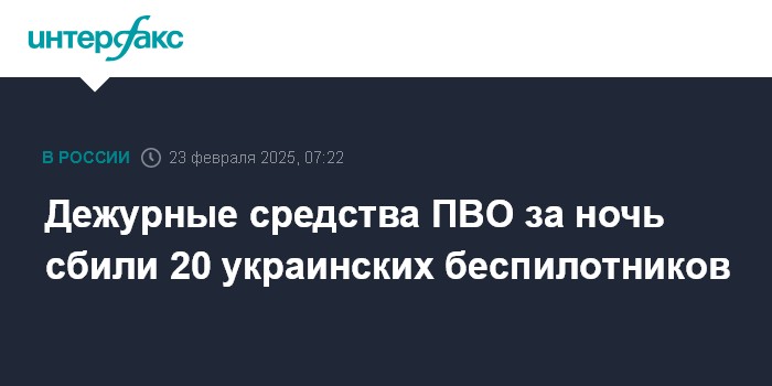 Москва. 23 февраля. INTERFAX.RU - За прошедшую ночь над территорией Российской Федерации было ликвидировано 20 дронов ВСУ, сообщили в Минобороны РФ.