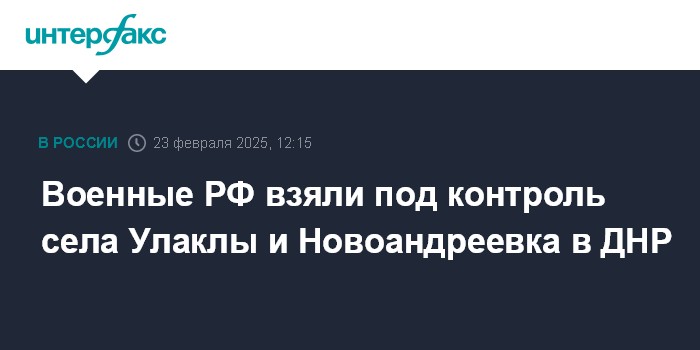 Москва. 23 февраля. INTERFAX.RU - Российские военные установили контроль над селами Улаклы и Новоандреевка в ДНР, заявило Минобороны РФ в воскресенье.