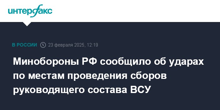 Москва. 23 февраля. INTERFAX.RU - Российские военные заявили, что нанесли удары по военным аэродромам Украины, местам проведения сборов руководящего состава ВСУ и подготовки операторов беспилотников, складам горючего.
