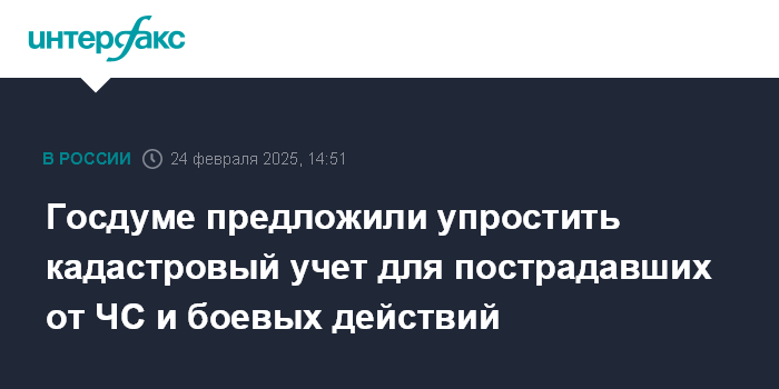Москва. 24 февраля. INTERFAX.RU - Комитет Госдумы по законодательству одобрил упрощение процедуры государственного кадастрового учета и регистрации прав на недвижимость для лиц, пострадавших в результате боевых действий или чрезвычайных ситуаций (ЧС).