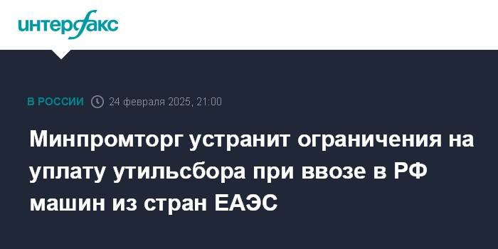 Москва. 24 февраля. INTERFAX.RU - Минпромторг уточнит правила уплаты утильсбора на автомобили при их ввозе в Россию с территории стран ЕАЭС, чтобы сбор можно было уплачивать не только на имеющиеся в соответствующем перечне ФТС модели автомобилей, но и на любые другие.