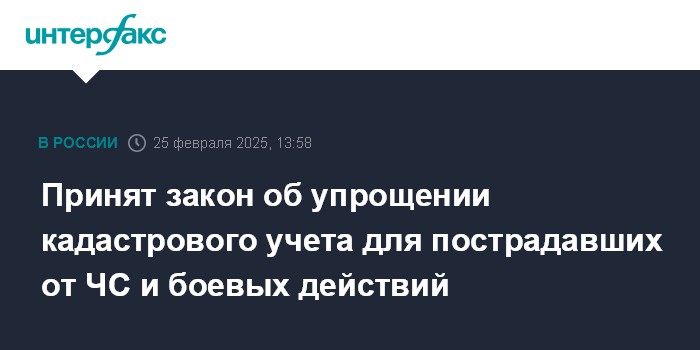 Москва. 25 февраля. INTERFAX.RU - Госдума приняла в третьем чтении законопроект № 637816-8, который упрощает процедуры государственного кадастрового учета и регистрации прав на недвижимость для лиц, пострадавших в результате боевых действий или чрезвычайных ситуаций.