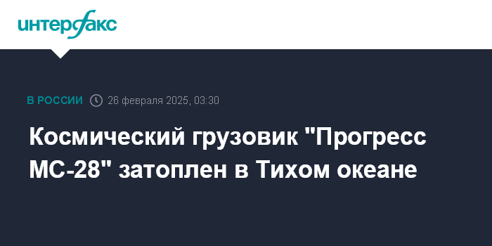 Москва. 26 февраля. INTERFAX.RU - Транспортный грузовой корабль "Прогресс МС-28", отстыковавшийся во вторник от Международной космической станции (МКС), затоплен в Тихом океане, сообщили в "Роскосмосе".