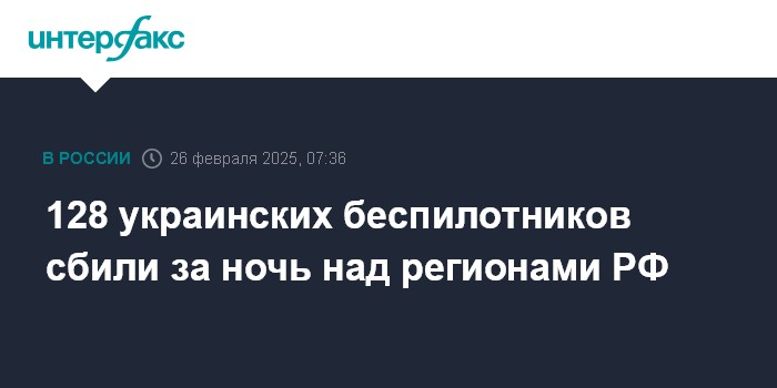 Москва. 26 февраля. INTERFAX.RU - Российские военные сбили 128 украинских беспилотников над регионами в ночь на среду, сообщили в Минобороны РФ.