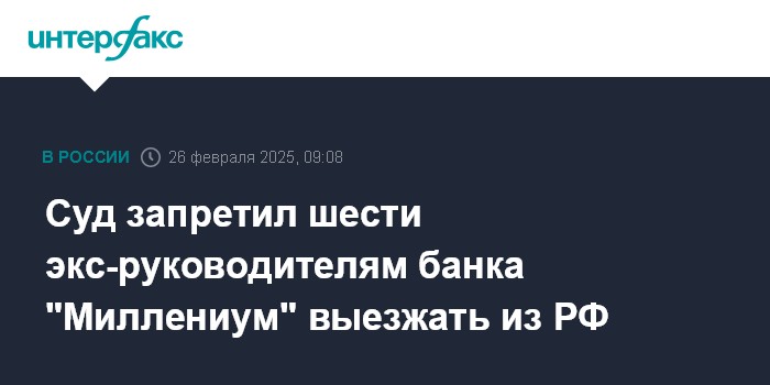 Москва. 26 февраля. INTERFAX.RU - Арбитражный суд Москвы 18 февраля по заявлению Агентства по страхованию вкладов (АСВ, конкурсный управляющий московского банка "Миллениум") запретил шести бывшим руководителям банка выезжать из России до полного исполнения решения суда о привлечении их к субсидиарной ответственности по обязательствам банка.