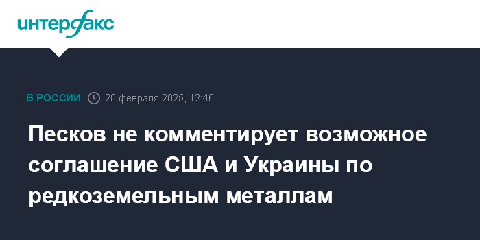 Москва. 26 февраля. INTERFAX.RU - В Кремле воздержались от комментариев касательно возможного подписания в пятницу соглашения Украины и США по редкоземельным металлам, так как пока официальных заявлений на этот счет не было, сообщил пресс-секретарь президента РФ Дмитрий Песков.
