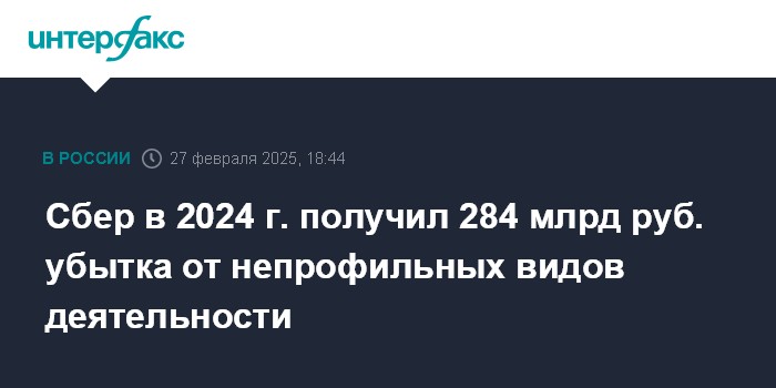Сбер в 2024 г. получил 284 млрд руб. убытка от непрофильных видов деятельности