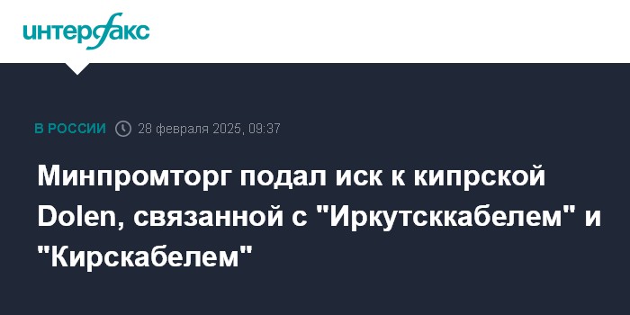 Минпромторг подал иск к кипрской Dolen, связанной с "Иркутсккабелем" и "Кирскабелем"