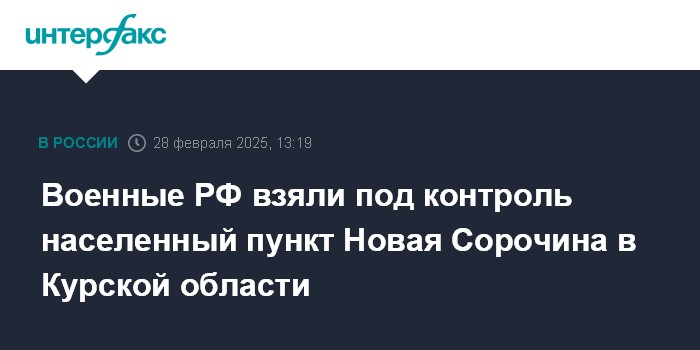Москва. 28 февраля. INTERFAX.RU - Российские военные вернули под контроль населенный пункт Новая Сорочина в Курской области, сообщили в Минобороны РФ.