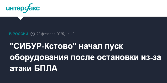 Москва. 28 февраля. INTERFAX.RU - "СИБУР-Кстово" проводит пуск оборудования, выведенного в конце января в резервный режим после атаки БПЛА.