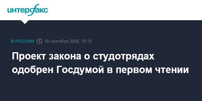Москва. 18 сентября. INTERFAX.RU - Госдума приняла в первом чтении внесенный правительством законопроект, направленный на создание и деятельность студенческих отрядов.
