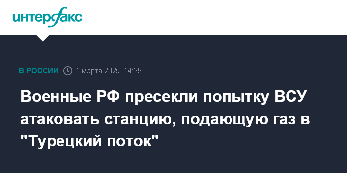 "В ночь на 28 февраля на фоне поездки Владимира Зеленского в Вашингтон киевский режим в целях остановки поставок газа в европейские страны предпринял очередную попытку атаки с применением трех БПЛА самолетного типа по инфраструктуре компрессорной станции "Русская" в населенном пункте Гай-Кодзор (Краснодарский край), обеспечивающей подачу газа по трубопроводу "Турецкий поток", - говорится в его заявлении.