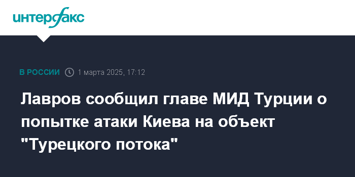 Москва. 1 марта. INTERFAX.RU - Глава МИД России Сергей Лавров в ходе телефонного разговора в субботу со своим турецким коллегой Хаканом Фиданом попросил Анкару использовать все возможности для пресечения попыток Киева атаковать объекты газопровода "Турецкий поток", заявили в российском внешнеполитическом ведомстве.