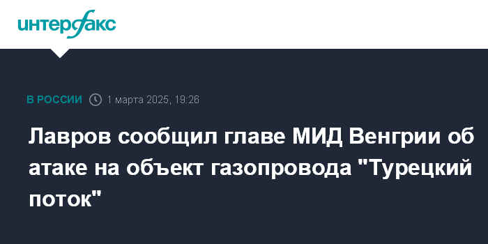 "Венгерского министра интересовали оценки, связанные с попытками киевского режима осуществить теракт в отношении инфраструктуры "Турецкого потока". С. В. Лавров предоставил необходимые разъяснения", - говорится в сообщении, размещенном в субботу в телеграм-канале МИД РФ.