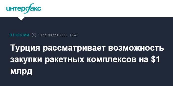 Вашингтон. 18 сентября. ИНТЕРФАКС - Турция рассматривает заявки США, России и КНР с целью покупки оборонительных ракетных комплексов дальнего действия на сумму не менее $1 млрд, сообщила в пятницу телекомпания CNN со ссылкой на официального представителя Минобороны этой страны Метина Гурака.