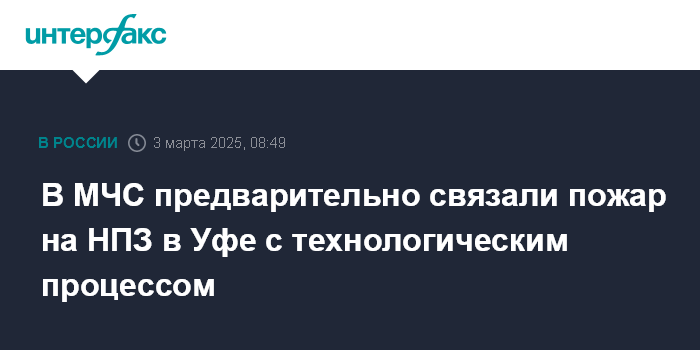 Москва. 3 марта. INTERFAX.RU - Пожар на Уфимском нефтеперерабатывающем заводе мог возникнуть в результате технологического процесса, сообщило региональное управление МЧС.