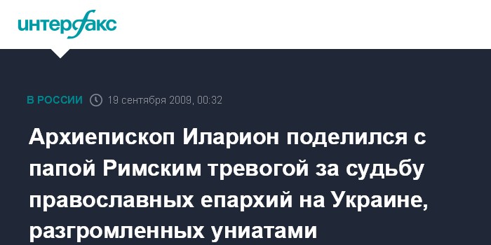 Москва. 19 сентября. ИНТЕРФАКС - Глава Отдела внешних церковных связей Московского патриархата архиепископ Волоколамский Иларион в беседе с папой Римским Бенедиктом XVI обратил внимание понтифика на положение православных Западной Украины, где в результате насильственных действий греко-католиков на рубеже 1980-1990-х годов были практически разгромлены три православные епархии.