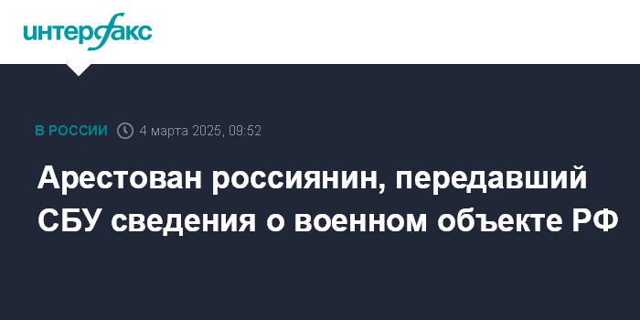 Москва. 4 марта. INTERFAX.RU - ФСБ сообщила о задержании и аресте гражданина России, передавшего Службе безопасности Украины (СБУ) информацию о работе режимного военного предприятия.