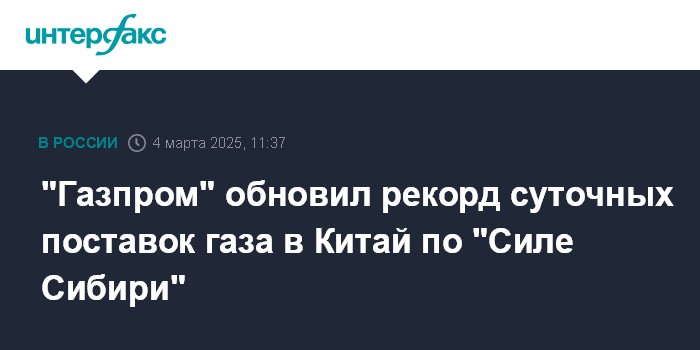 Москва. 4 марта. INTERFAX.RU - "Газпром" 3 марта зафиксировал новый исторический рекорд суточных поставок газа в Китай по "Силе Сибири".