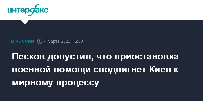 Москва. 4 марта. INTERFAX.RU - Приостановка американской военной помощи Украине, если это соответствует действительности, может сподвигнуть Киев к мирному процессу, считает пресс-секретарь президента РФ Дмитрий Песков.