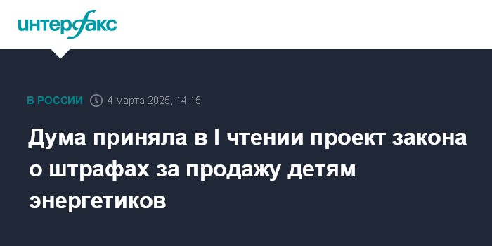 Москва. 4 марта. INTERFAX.RU - Госдума на заседании во вторник приняла в первом чтении законопроект об административной ответственности за продажу энергетиков несовершеннолетним.