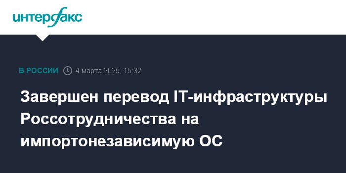 Москва. 4 марта. INTERFAX.RU - "Группа Астра" и Федеральное агентство по делам СНГ, соотечественников, проживающих за рубежом, и по международному гуманитарному сотрудничеству (Россотрудничество) завершили перевод ведомства на импортонезависимую операционную систему Astra Linux и службу каталога ALD Pro, сообщила пресс-служба вендора.