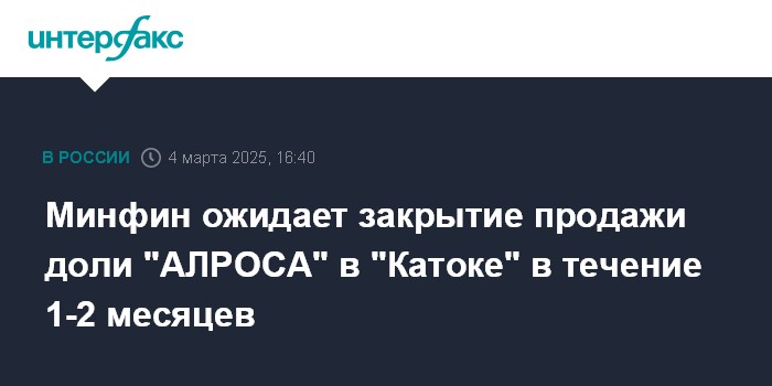 Минфин ожидает закрытие продажи доли "АЛРОСА" в "Катоке" в течение 1-2 месяцев