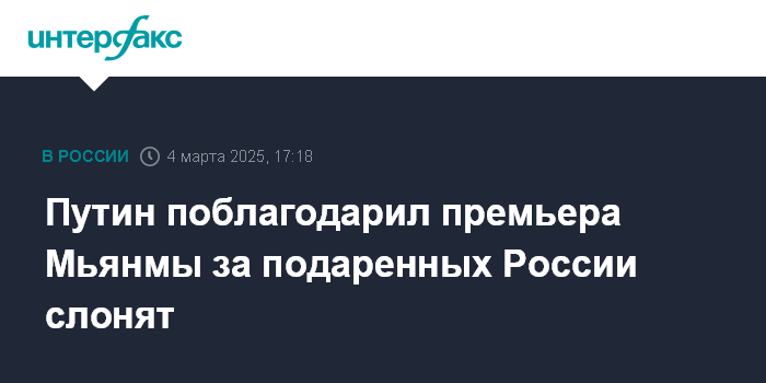 Москва. 4 марта. INTERFAX.RU - Президент РФ Владимир Путин поблагодарил премьер-министра Республики Союз Мьянмы Мин Аун Хлайна за подарок Мьянмы России в честь 75-летия установления дипотношений - шесть слонят.