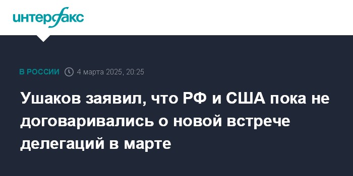 "Пока об этом не договаривались", - сказал Ушаков, отвечая на вопрос телеграм-канала "Юнашев Live", может ли новая встреча российской и американской делегаций пройти в этом месяце.