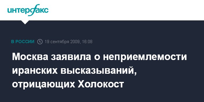 Москва. 19 сентября. INTERFAX.RU - Официальный представитель МИД РФ назвал неприемлемыми прозвучавшие 18 сентября в Тегеране заявления, ставящие под сомнение реальность Холокоста.