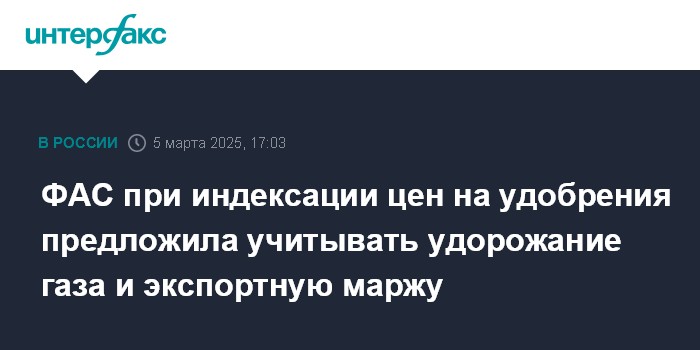Москва. 5 марта. INTERFAX.RU - Федеральная антимонопольная служба считает индексацию внутренних цен на минеральные удобрения возможной, если необходимость повышения будет обоснована.
