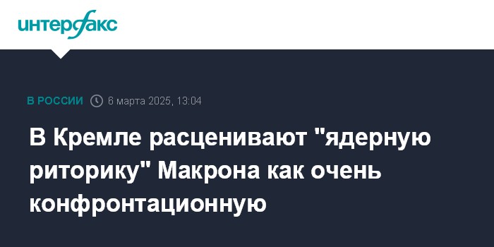 "Если почитать выступление Макрона, то такое ощущение, что Франция ищет продолжения войны. Более того, Франция уже готова использовать свои ядерные вооружения в деле безопасности. Это уже такая ядерная риторика, претензия на ядерное лидерство в Европе. То есть это очень и очень конфронтационно", - сказал Песков журналистам в четверг.