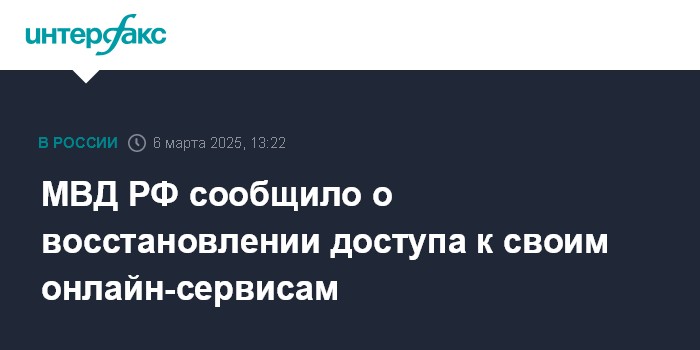 Москва. 6 марта. INTERFAX.RU - Доступ к онлайн-сервисам МВД РФ в четверг был ограничен из-за проведения технических работ, в настоящий момент он восстановлен, сообщила официальный представитель министерства Ирина Волк.