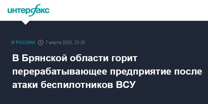 Москва. 7 марта. INTERFAX.RU - Пожар начался на перерабатывающем предприятии в городе Стародуб Брянской области в результате атаки украинских беспилотников, сообщил в пятницу губернатор Александр Богомаз.