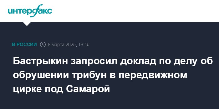 Москва. 8 марта. INTERFAX.RU - Глава Следственного комитета России Александр Бастрыкин запросил доклад о ходе расследования уголовного дела по факту обрушения трибун в передвижном цирке в Нефтегорске в Самарской области, сообщила пресс-служба СК РФ.