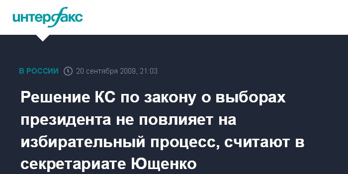 Киев. 20 сентября. ИНТЕРФАКС-УКРАИНА - Решение Конституционного суда по обновленному закону о выборах президента Украины не повлияет на избирательный процесс, считает глава секретариата президента Вера Ульянченко.