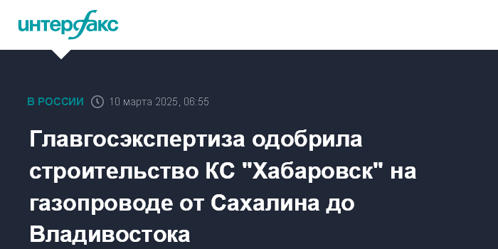 Москва. 10 марта. INTERFAX.RU - ПАО "Газпром" получило положительное заключение государственной экспертизы в отношении очередного этапа расширения магистрального газопровода "Сахалин - Хабаровск - Владивосток".